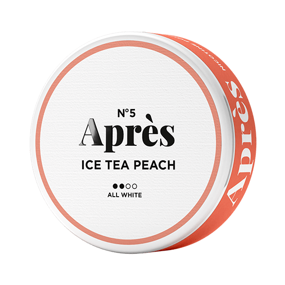 APRÈS Ice Tea Peach nicotine pouches offer a delightful fusion of sweet peach and subtle black tea flavors, delivering a refreshing taste experience. Each slim, all-white pouch contains 4.4 mg of nicotine, providing a mild sensation suitable for those seeking a gentle nicotine effect. The discreet design ensures a comfortable fit under the lip, allowing for use anytime without staining teeth. Produced by APRÈS Nicotine AB, these tobacco-free pouches exemplify high-quality standards and innovative flavor combinations.