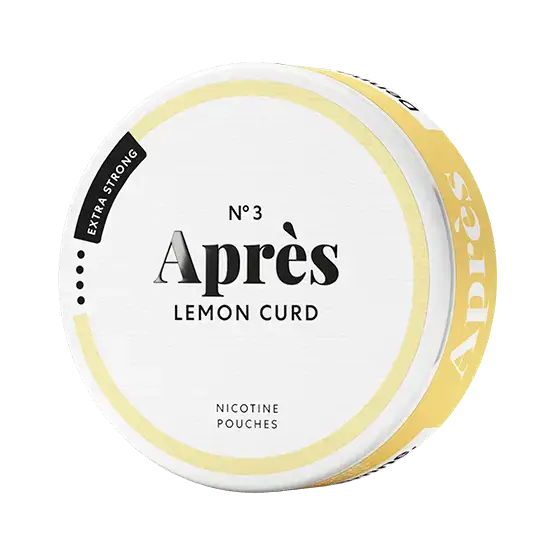 APRÈS Lemon Curd Extra Strong nicotine pouches deliver a sweet and tangy lemon flavor reminiscent of classic lemon curd. Each slim, all-white pouch contains 8.3 mg of nicotine, providing a robust sensation suitable for experienced users. The discreet design ensures a comfortable fit under the lip, allowing for use anytime without staining teeth. Produced by APRÈS Nicotine AB, these tobacco-free pouches exemplify high-quality standards and innovative flavor combinations.