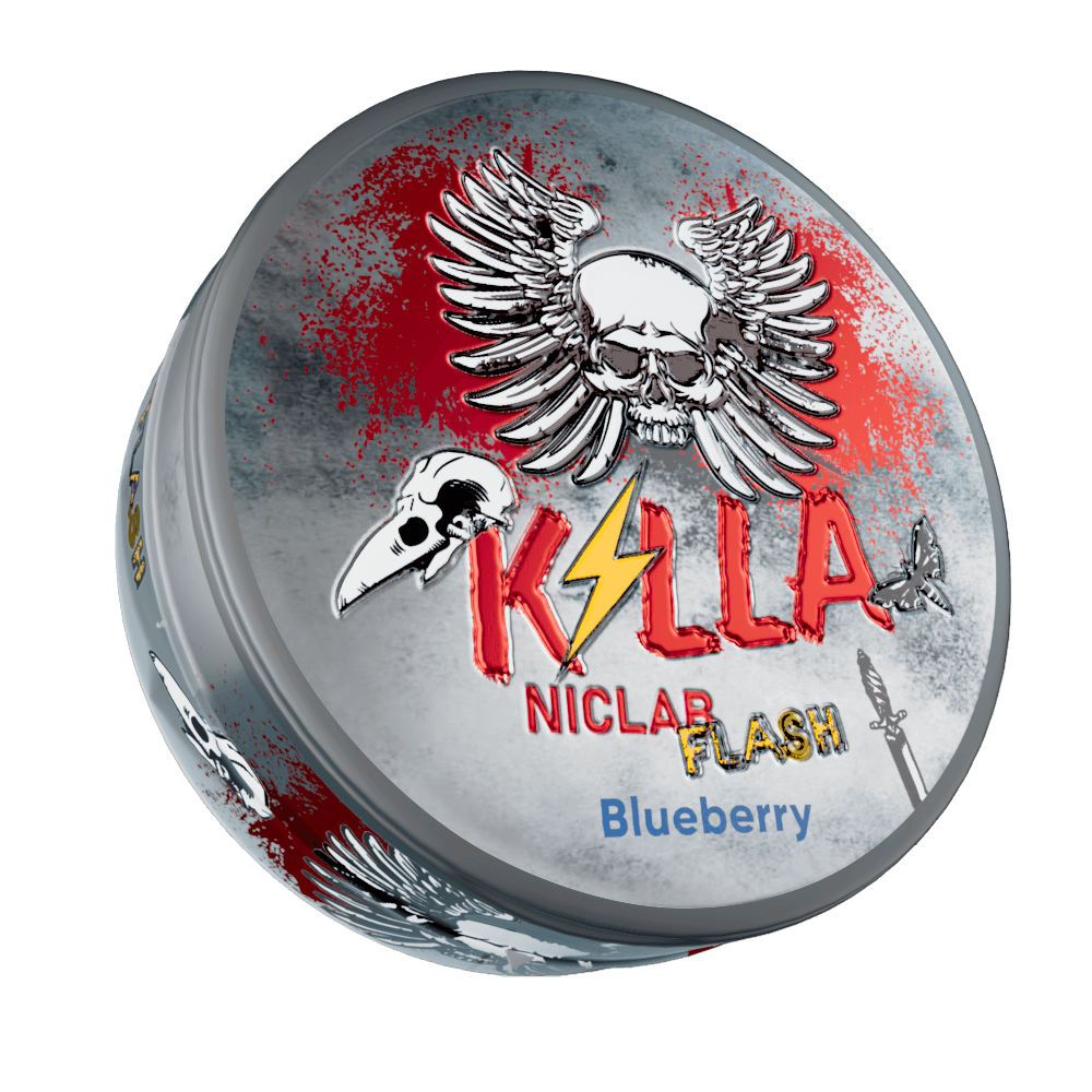 KILLA Blueberry is nicotine pouches with a blueberry flavor. The flavor is introduced early and has a clear blueberry character with a mild sweetness. The product is tobacco-free and manufactured by N.G.P Tobacco ApS in Denmark. The pouches are produced as white nicotine pouches. The nicotine content is specified as 5 mg nicotine per gram. The total net weight per can is 24 grams. The product is formulated using water, cellulose, acidity regulators, humectants, natural flavoring agents, nicotine, and preservatives. KILLA Blueberry is part of the KILLA range of tobacco-free nicotine pouches and is produced with a lower nicotine content per gram.