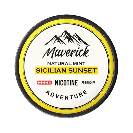 MAVERICK Sicilian Sunset nicotine pouches deliver a smooth and juicy citrus flavor enhanced with an icy cooling effect. This combination creates a refreshing and fruity taste profile that is both sweet and invigorating. Each slim, green nicotine pouch contains 12.5 mg of nicotine, offering a high-strength kick that’s well-suited for experianced users who enjoy balanced flavor and steady intensity. Unlike most nicotine pouches, MAVERICK is made out of natural mint, giving each flavour a boost of mintyness. Discreet, comfortable, and stain-free, MAVERICK Sicilian Sunset is crafted by 77 Group to ensure high quality, bold taste, and a tobacco-free experience.